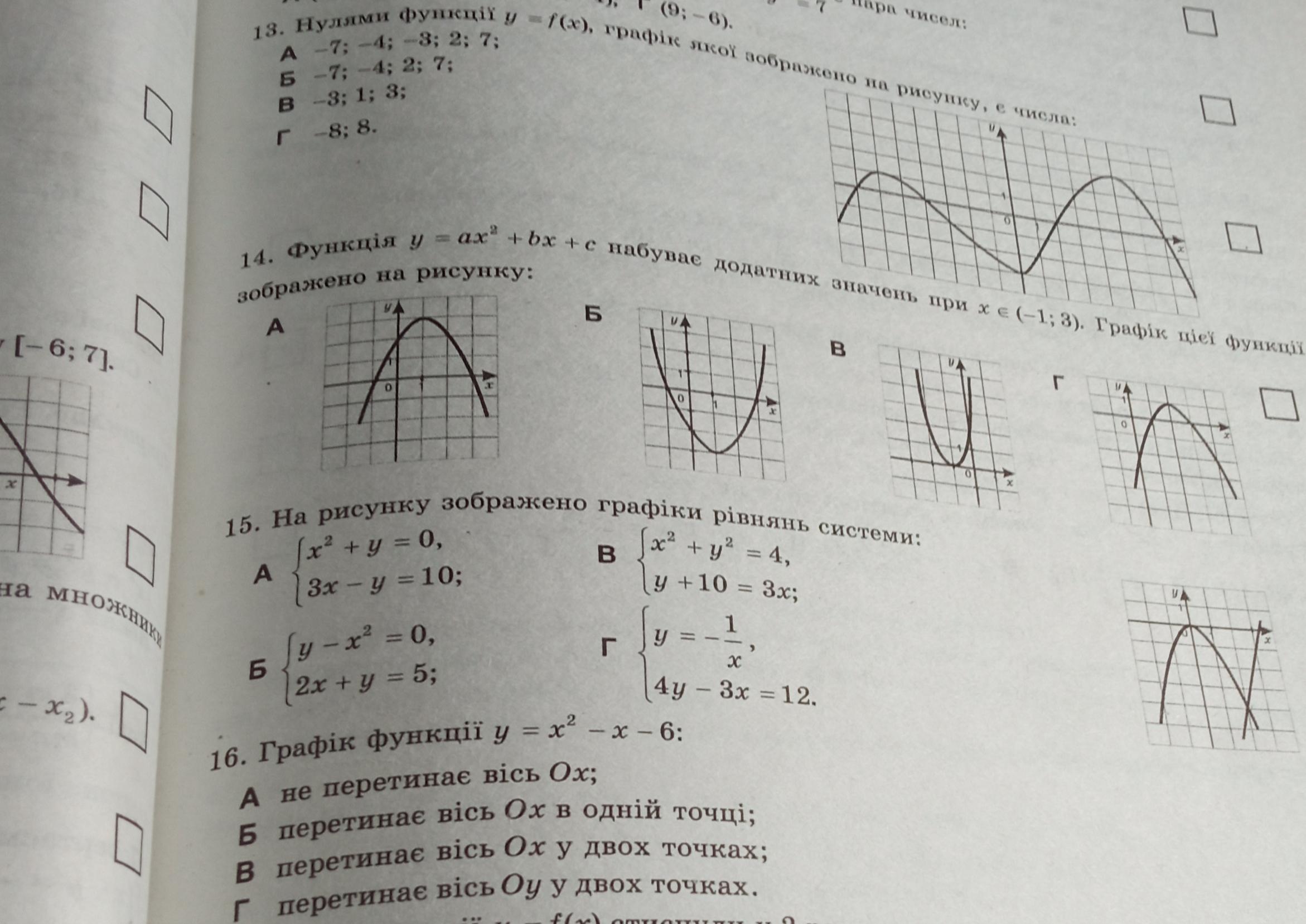 16- Парабола пересекоет ось ОХ в точках (-2;0) и (3;0). OY в точке (0;-6)