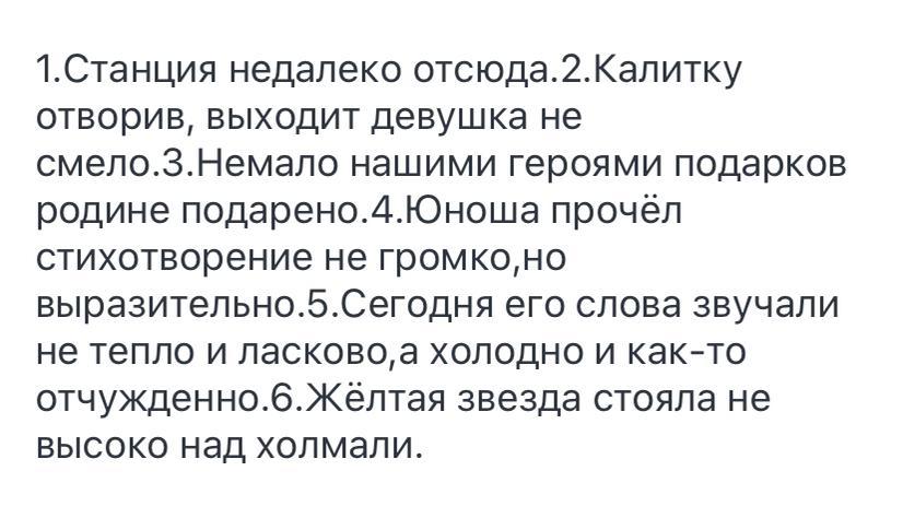 1.Станция недалеко отсюда.2.Калитку отворив, выходит девушка не смело.3.Немало нашими героями подарков родине подарено.4.Юноша прочёл стихотворение не громко,но выразительно.5.Сегодня его слова звучали не тепло и ласково,а холодно и как-то отчужденно.6.Жёлтая звезда стояла не высоко над холмали.