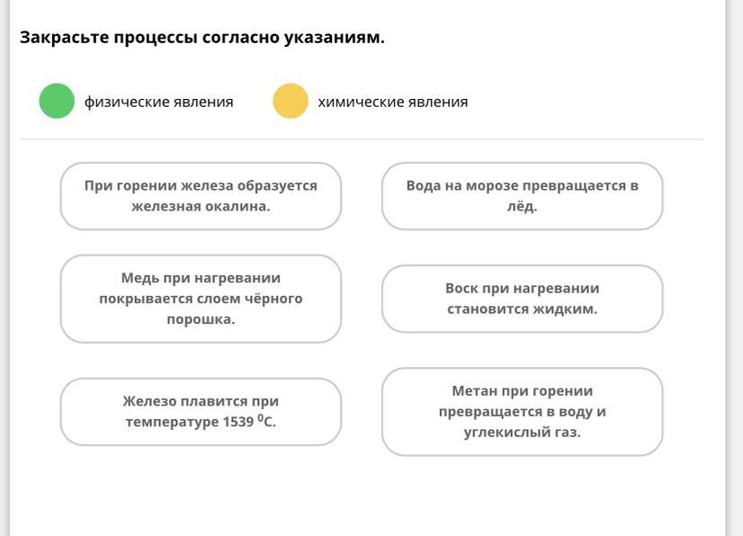 Химические: При горении железа образуется железная окалина.; Медь при нагревании покрывается слоем черного порошка.;