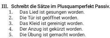 Schreibt die Sätze im Plusquamperfekt Passiv. Das Lied ist gesungen worden. 2. 1. Die Tür ist geöffnet worden. Das Kleid ist gereinigt worden. 4. 3. Der Anzug ist gekürzt worden. 5. Die Übung ist gemacht worden.