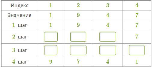 После сортировки массива (сортировка методом простого выбора) — порядок убывающий. Проанализируй и заполни таблицу.