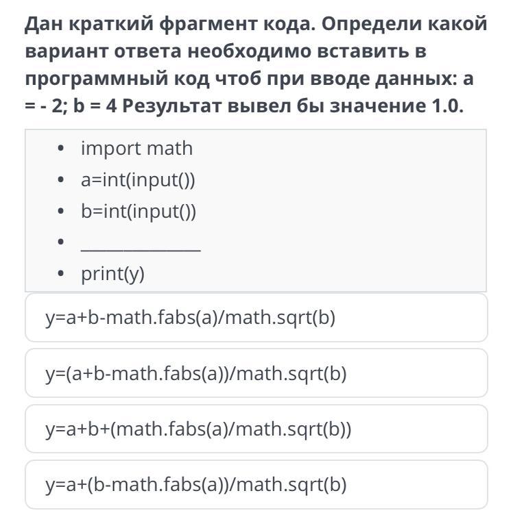 Дан краткий фрагмент кода . Определи какой вариант ответа необходимо вставить в программный код чтоб при вводе данных : а - - 2 ; b = 4 Результат вывел бы значение 1.0 . —