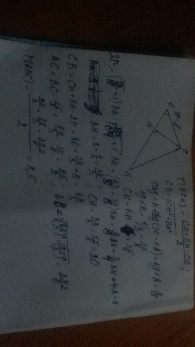 В прямоугольном треугольнике ABC с гипотенузой AB проведена высота CH. Радиус вписанной окружности треугольника BCH равен 4, а тангенс угла BAC равен 8/15. Найдите радиус вписанной окружности треугольника ABC.