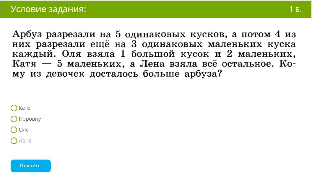 Катя взяла большой кусок и ещё 2 трети. И Оля тоже. Столько же досталось и Лене