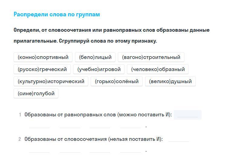 1. русско-греческий (русский и греческий); учебно-игровой (учеба и игра); культурно-исторический (история и культура); горько-соленый (горький и соленый); сине-голубой (синий и голубой)