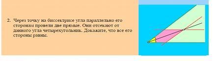 Через точку на биссектрисе угла , параллельно его сторонам, провели две прямые.Они отсекают от данного угла четырехугольник.Докажите , что все его стороны равны