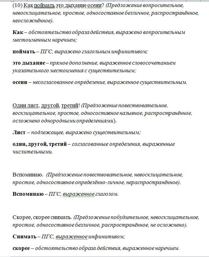 Выполнить синтаксический разбор предложений: 10,14, 24,25,26. 1)Волшебная осень парков. (2)Тихо. (3)Чуть-чуть сыр…вато. (4)Листья не(?)хотя отрывают(?)ся и словно пов…сают на невидимых паутинах. (5)Долго – долго падают кленовые листья. (6)Как они хороши. (7)Хотелось сказать садовнику, чтобы не подметал. (8)Пусть бы ходили люди по золотому ковру. (9)Как же снять? (10)Как поймать это дыхание осени? (11) Кажет(?)ся, листья падают не без(?)вучно. (12)Кажется, полёт сопровождает какая-то музыка. (13)Бом – бом. (14)Один лист, другой, третий! (15) Стройная музыка в парке. (16)Музыка листопада. (17)Один ли я её слышу? (18)Нет. (19)Вот и девочка подняла голову, бл…стящими глазами провожает листья. (20)Рядом женщина под зонтиком. (21)Книга. (22)Но она не читает. (23)Она слушает золотой хоровод. (24)Вспом…наю. (25)Скорее, скорее снимать. (26)Поймать хоть отрывок музыки листопада.