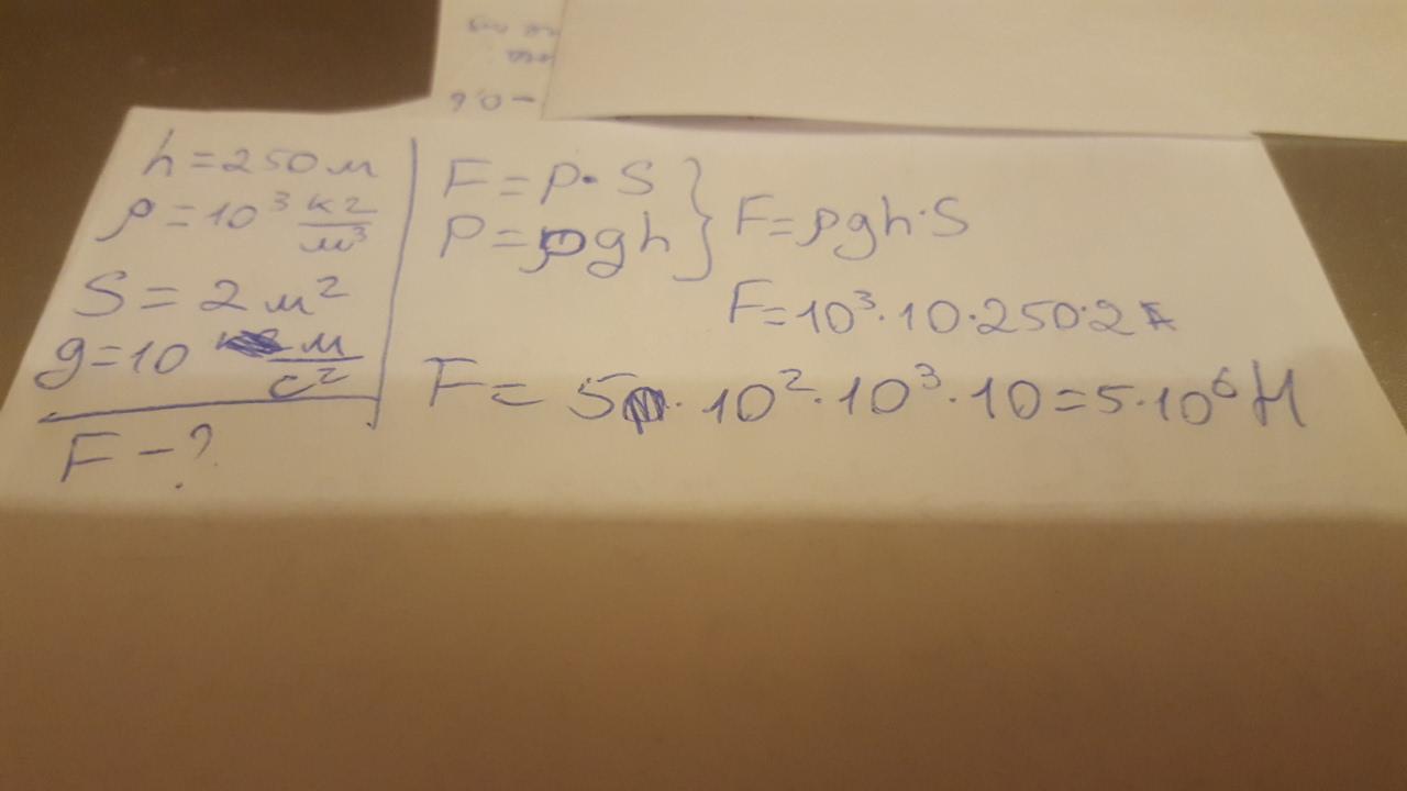 водолаз в скафандре может погружаться на глубину более 250 м вычислите силу давления воды на этой глубине на тело водолаза если площадь костюма 2м в квадрате плоность воды 10 в кубе кг/м в кубе