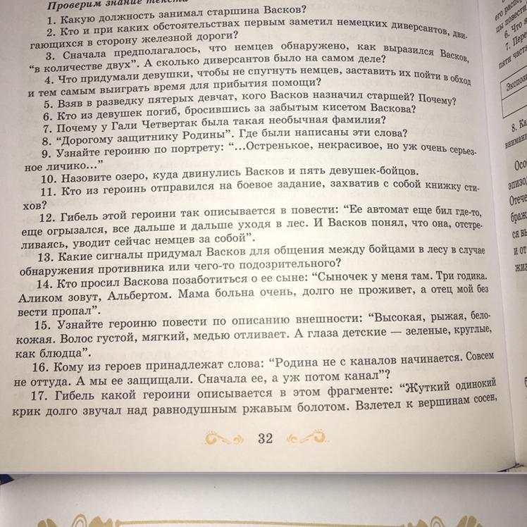 2)Рита Осянина. Рита тайно их отвозила к матери и сыну в город. Об этом узнала помкомвзвода Кирьянова, и боялась, что та донесет на нее Васкову. Рита больше всего любила ранние утренние возвращения из города, когда опасность была уже позади. А зори здесь были тихими-тихими, Рита уже почти подошла к разъезду. Вдруг на дороге она увидела человека и быстро юркнула в ольшаник. Вскоре показался и второй человек: это были немцы. Рита затаилась в кустах и сунула в рот кулак, чтобы не закричать от страха. Как только немцы скрылись, Рита разбудила Васкова и доложила ему о случившемся.