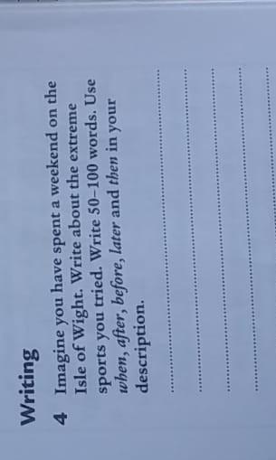 all by Writing 4 Представьте, что вы провели выходные на острове Уайт. Напишите об экстремальных видах спорта, которые вы пробовали. Напишите 50–100 слов. Используйте когда, после, до, позже, а затем в своем описании.