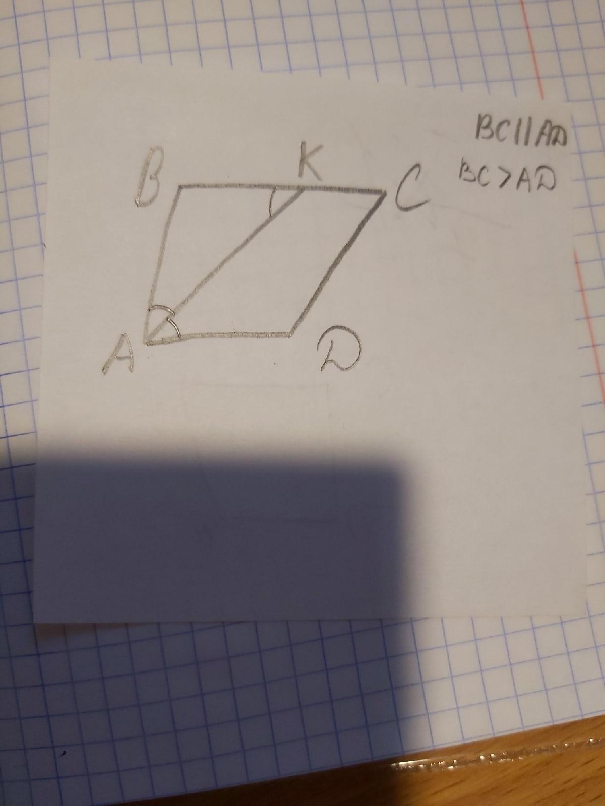 Так как угол ВАD делится биссектрисой АК пополам, то угол BAD= углу KAD. ВС // AD по условию, а АК секущая, то угол ВКА = углу KAD. Из этого можно сделать вывод: так как углы BAK и BKA равны и равны при основании следавательно треугольник АВК равнобедренный ч. т. д.