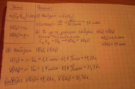 Какой V кислорода(при нормальных условиях) надо затратить и какой V углекислого газа(при нормальных условиях)образуется при сжигании 20 г гептана( C7H16 входит в состав бензина )