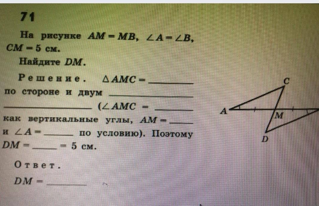 △AMC = △BMD по стороне и двум углам (∠AMC = ∠BMD как вертикальные углы, AM = MB и ∠A = ∠B по условию). Поэтому ВM = СM = 5 см