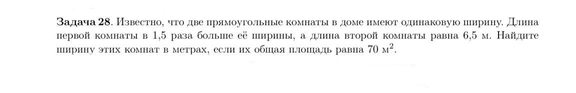 Ширина комнаты 1 = ширине комнаты 2 = х. Длина комнаты 1 = 1,5х. Длина клмнаты 2 = 6,5м. Сумма площадей ( ширина на длину) этих комнат = 70: