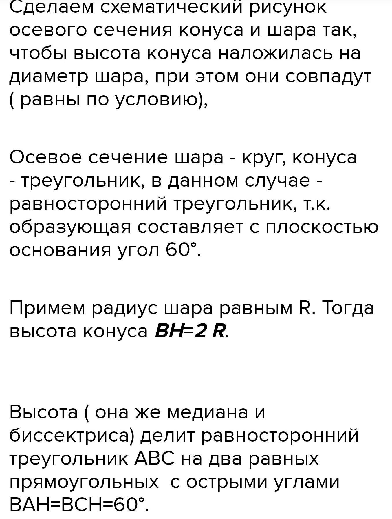 Радиус шара равен высоте конуса, образующая которого составляет с плоскостью угол 30. Найдите отношение объемов конуса и шара