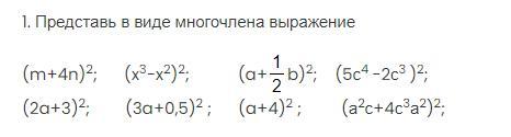 (m+4n)²; (x^3−x^2)²; (a+1 1/2b)²; (5с^4 -2с³ )²;