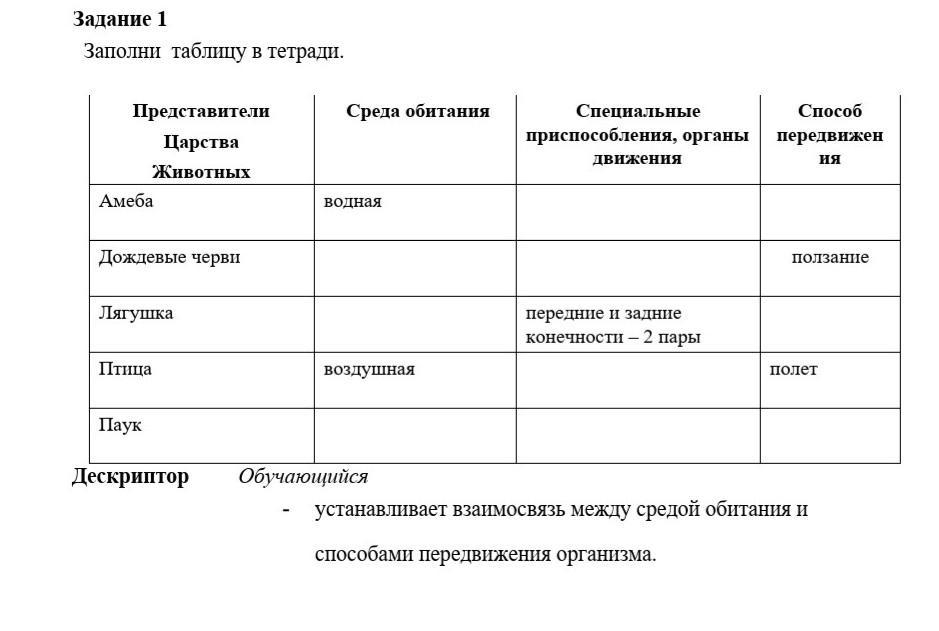 Паук - среда обитания - наземная, органы передвижения - лапы, способ передвижения - ходьба.