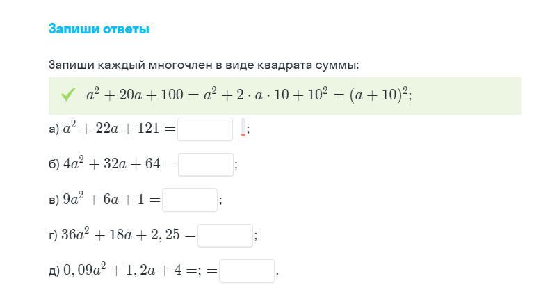 г) 36a^2+18a+2,25= 6^2*a^2+2*a*6*1,5+1,5^2=(6а+1,5)^2