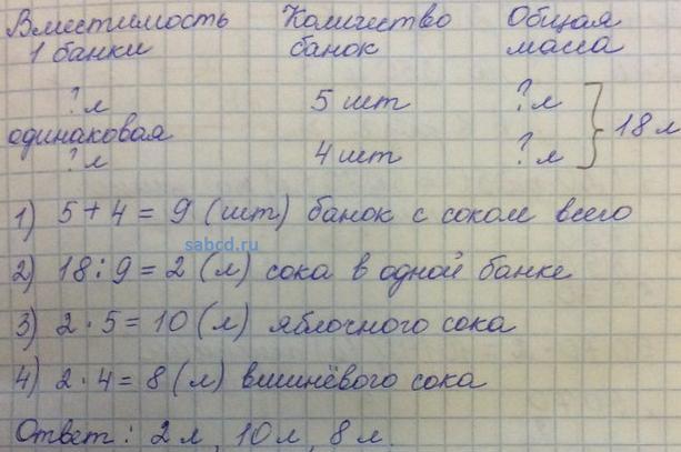 Решите мне задачу мама заготовила 18 литрав сока у нее получилось 5 одинаковых банок яблочного сока и 4 таких-же вижнового скок литрав сочка в 1 банке скок литров яблокчного сачка