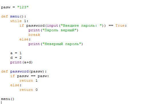 Напишите программу,которая предлагает ввести пароль и не переходит к выполнению основной части,пока не введён правильный пароль. Основная часть-вывод на экран «секретных данных».
