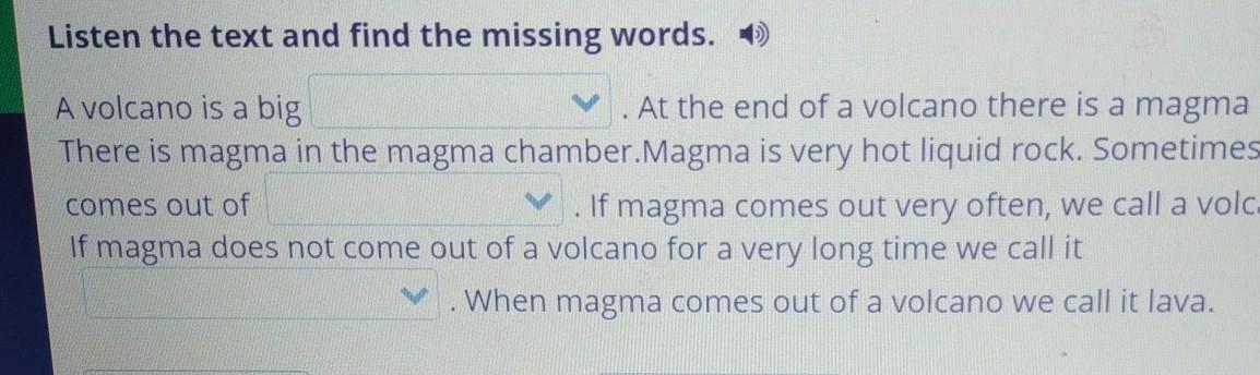 A volcano is a big (mountain,magma chamber,a volcano).At the end of a volcano there is a magma chamber There is magma in the magma chamber.Magma is very hot liquid rock. Sometimes magma comes out of(mountain, magma chamber,a volcano).If magma comes out very often,we call a volcano active . If magma does not come out of a volcano for a very long time we call it(an inactive volcano,magma chamber, mountain) . When magma comes out of a volcano we call it lava.