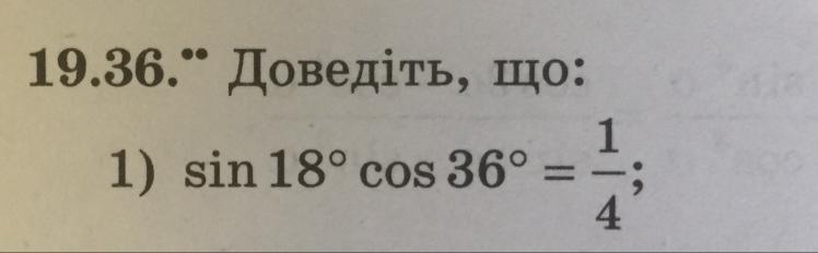 sin18^\circ \cdot cos36^\circ =\dfrac{2\, cos18^\circ \cdot sin18^\circ \cdot cos36^\circ }{2\, cos18^\circ }=\dfrac{sin36^\circ \cdot cos36^\circ }{2\, cos18^\circ }=\\\\\\=\dfrac{\dfrac{1}{2}\cdot sin72^\circ }{2\, cos18^\circ }=\dfrac{sin72^\circ }{4\, cos18^\circ }=\dfrac{sin(90^\circ -18^\circ )}{4\, cos18^\circ }=\dfrac{cos18^\circ }{4\, cos18^\circ }=\dfrac{1}{4}