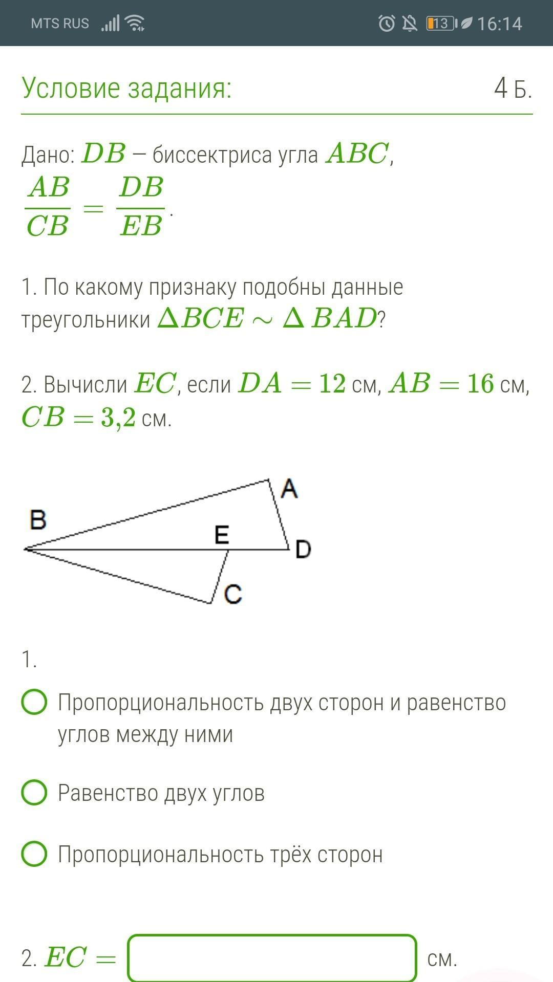 2. Вычисли EC , если DA= 12 см, AB= 16 см, CB= 3,2 см.