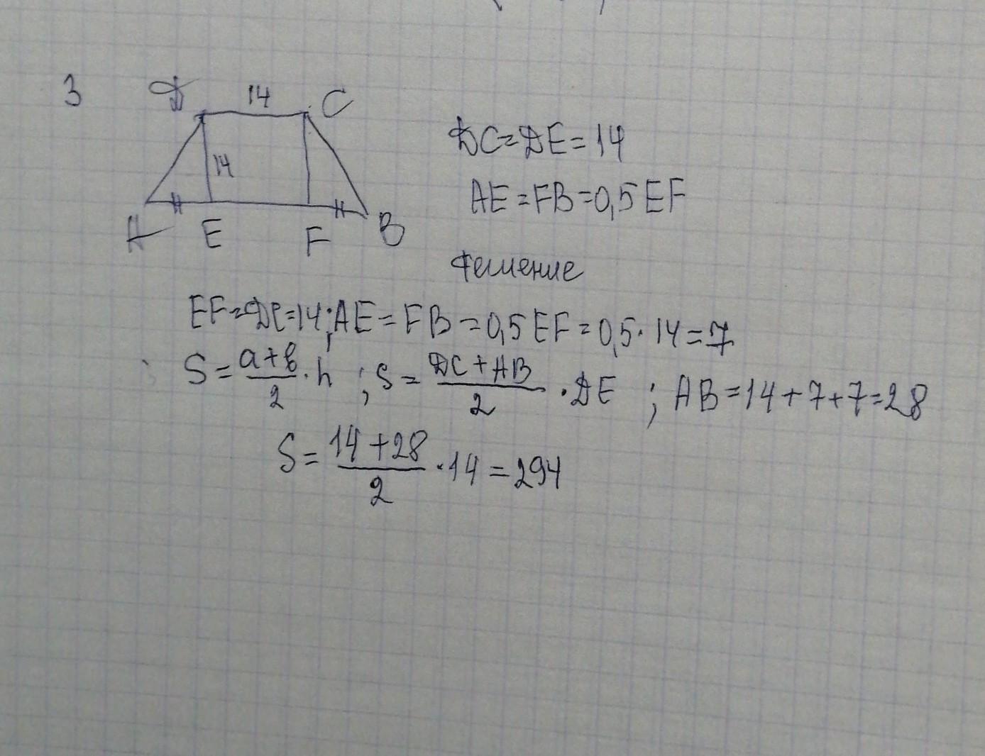 3. В равнобедренной трапеции ABCD с основаниями AB и CD, DE и CF – высоты. Найдите площадь трапеции, если DC=DE=14, AE=FB=0,5EF.