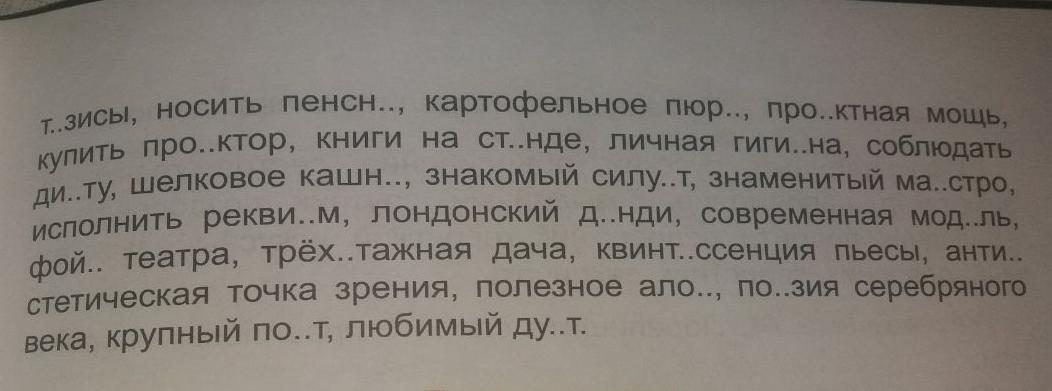 Русский эпос, выступать на эстраде, открытие музея, написать тезисы, носить пенсне, картофельное пюре, проектная мощь, купить проектор, книги на стенде, личная гигиена, соблюдать диету, шёлковое кашне, знакомый силуэт, знаменитый маэстро, исполнить реквием, лондонский дэнди, современная модель, фойе театра, трехэтажная дача, квинтэссенция пьесы, антиэстетическая точка зрения, полезное алоэ, поэзия Серебряного века, крупный ? поэт, любимый дуэт.