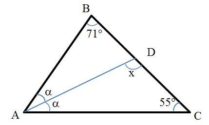 ∠A+∠B+∠C = 180° или ∠A = 180°-∠B-∠C = 180° - 71° - 55° = 54°.