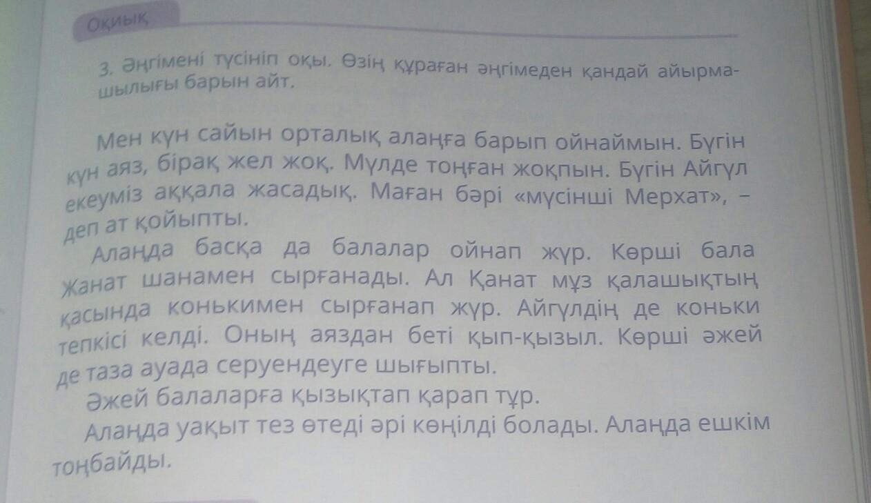 На поле играли и другие дети.Соседский мальчик Жанат катался на санках.А Канат катался на коньках возле ледяной горки.Айгуль тоже хотела покататься на коньках.У нее от холода щеки красными были.Соседская бабушка тоже вышла прогуляться на свежем воздухе.
