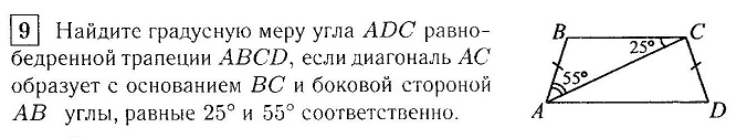 найти угол адс р/б трапеции авсд ,если диагональ ас образует с основанием вс и боковой стороной ав углы ,равнык 25 и 55 градусов соответсвенно