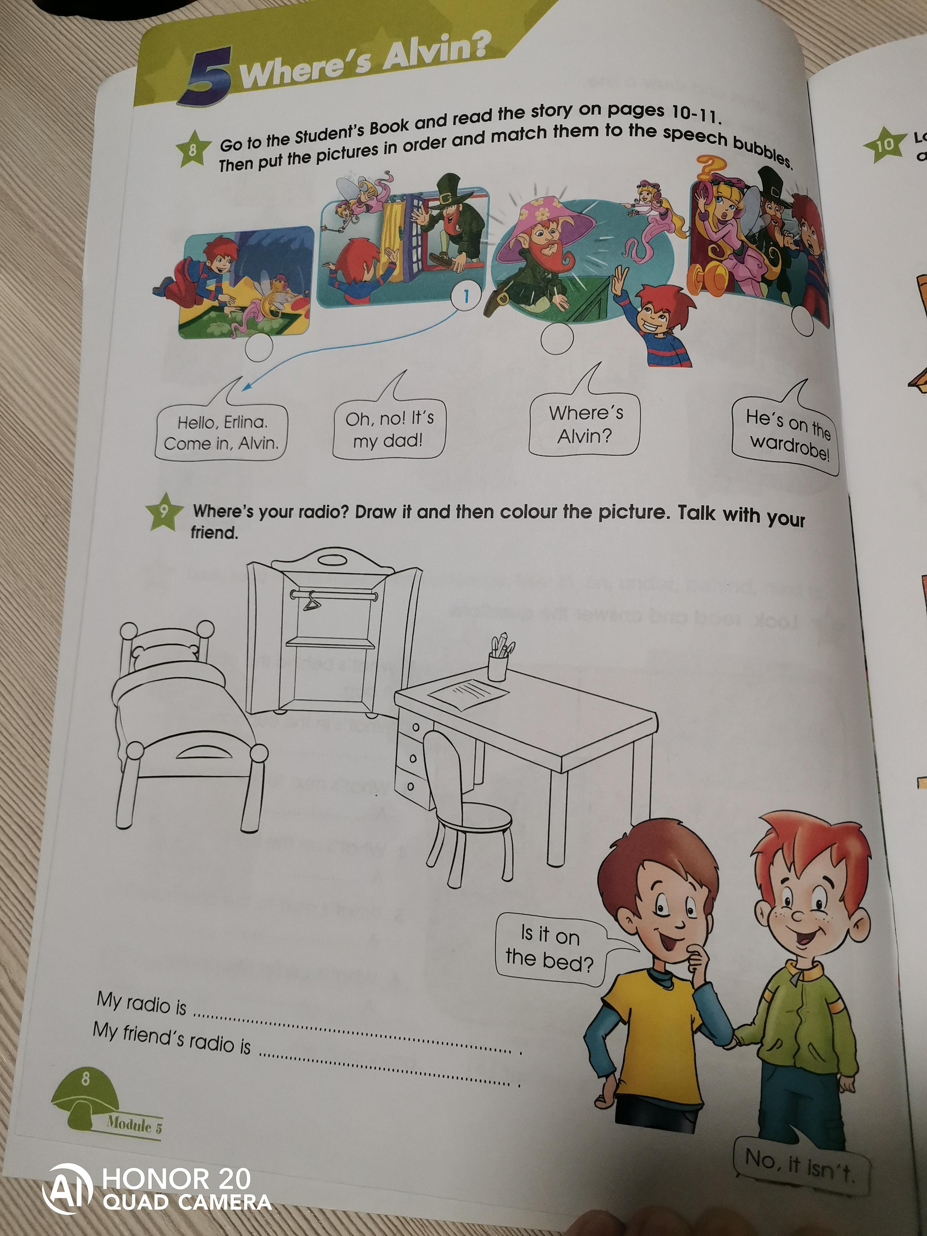 там нужно нарисовать вроде))) нарисуй на столе радио и my radio is it on table а во втором my friend radio is on a bed