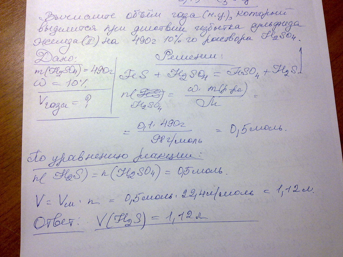 Вычислите объём газа (н.г.), который выделиться при действии избытка сульфида железа 2 на 490г 10%-ного раствора серной кислоты.