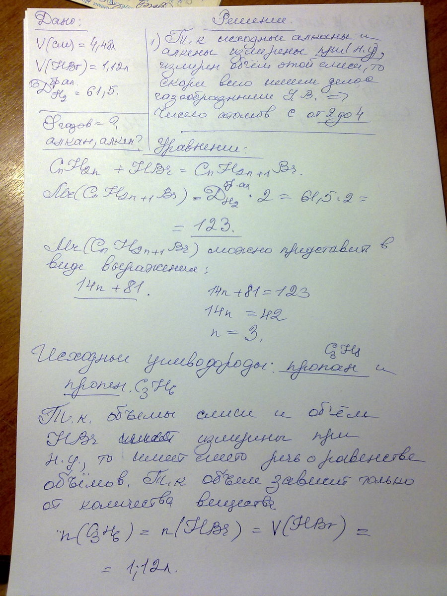 Смесь алкана и алкена объемом 4,48 л (н.у.) с одинаковым числом атомов С в молекуле реагирует с 1,12л (н.у.) HBr, причем полученный бромалкан в 61,5 раза тяжелее водорода. Что это за углеводороды и каковы их объемные доли в исходной смеси?