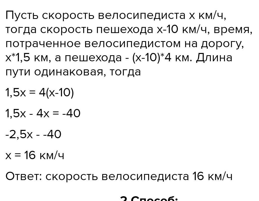 Путь от поселка до города пешеход прошёл за 4 часа , а велосипедист проехал за за 1,5 часа . Скорость велосипедиста на 10 км ч больше скорости пешехода. Найдите скорость велосипедиста .