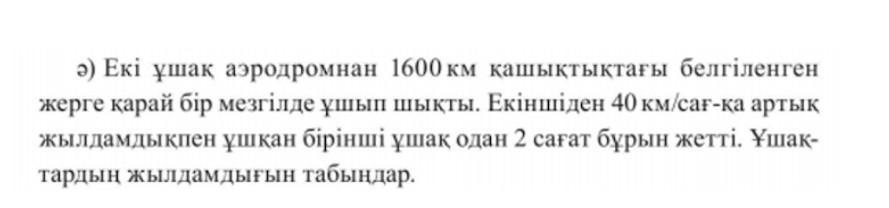 Два самолета планируется на расстоянии 1600 км от аэродрома. одновременно слетел на землю. Более 40 км / ч со второго Первый скоростной самолет прибыл на 2 часа раньше. Самолет- Найдите скорость