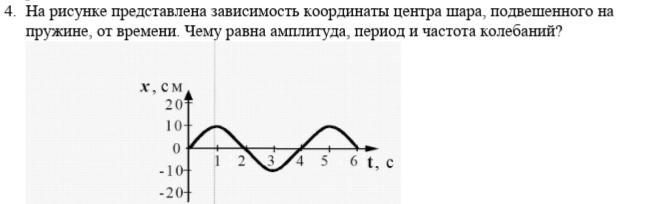 Амплитуда (размах по оси X) =20 см, период (время по оси t например от первого максимума до второго максимума) =4 секунды, частота это обратная величина периоду = 1/4=0,25 Герц.