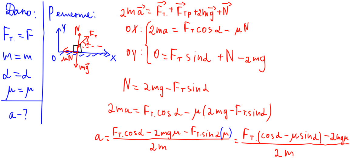 Двое саней массой m везем, прикладывая силу F, под углом альфа к горизонту. Найти ускорение, если коэффициент трения Ктр.