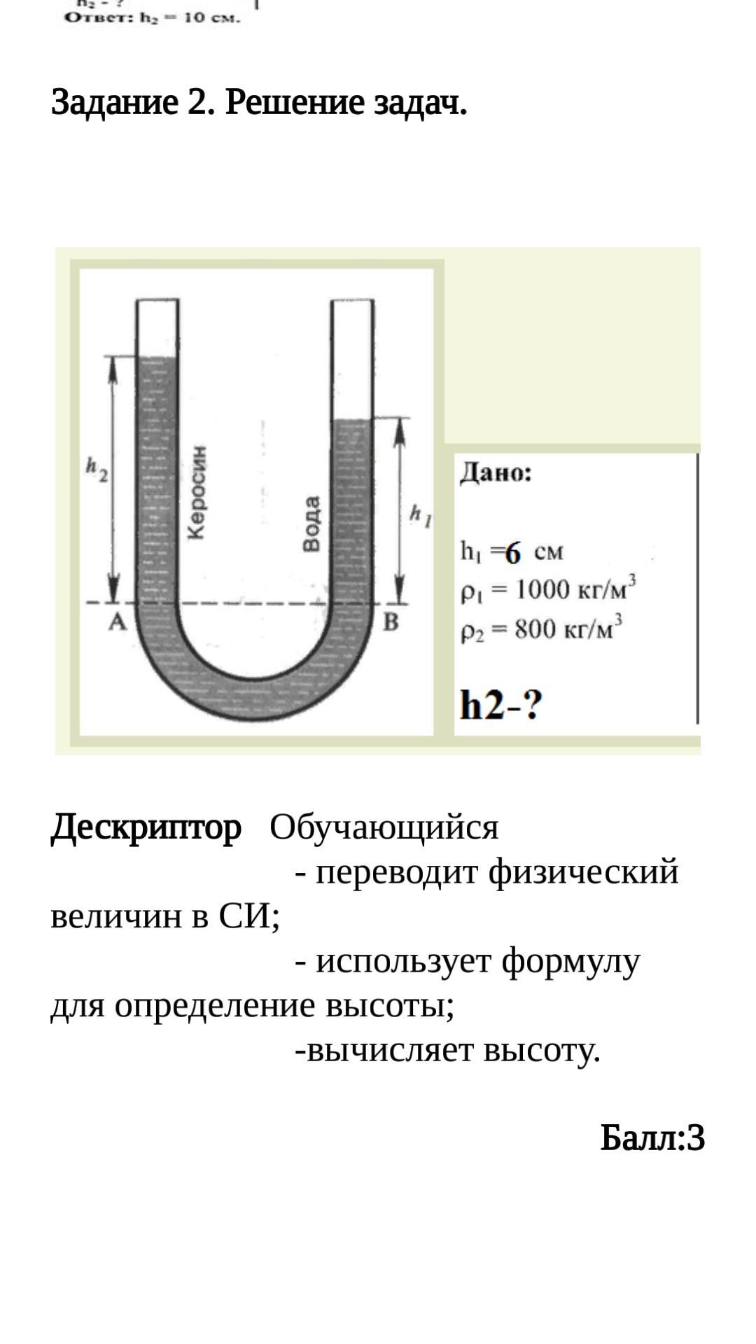 Решение задач. Дескриптор Обучающийся - переводит физический величин в СИ; - использует формулу для определение высоты; -вычисляет высоту.