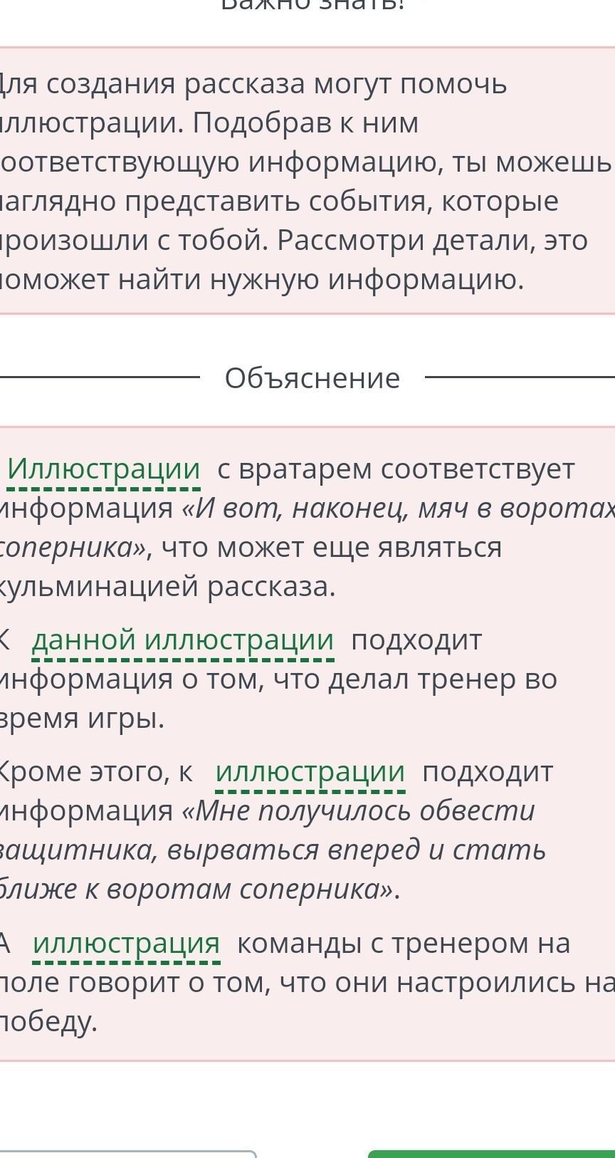 свой первый гол в футболе». Соотнеси иллюстрации и информацию из твоего рассказа.