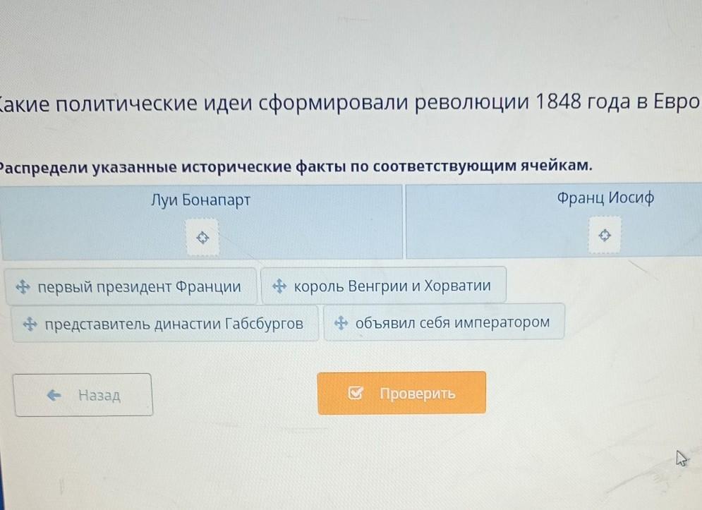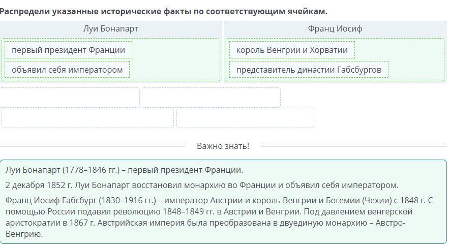 распредели указанные исторические факты по соответствующим ячейкам. Луи Бонапарт Франц Иосиф
