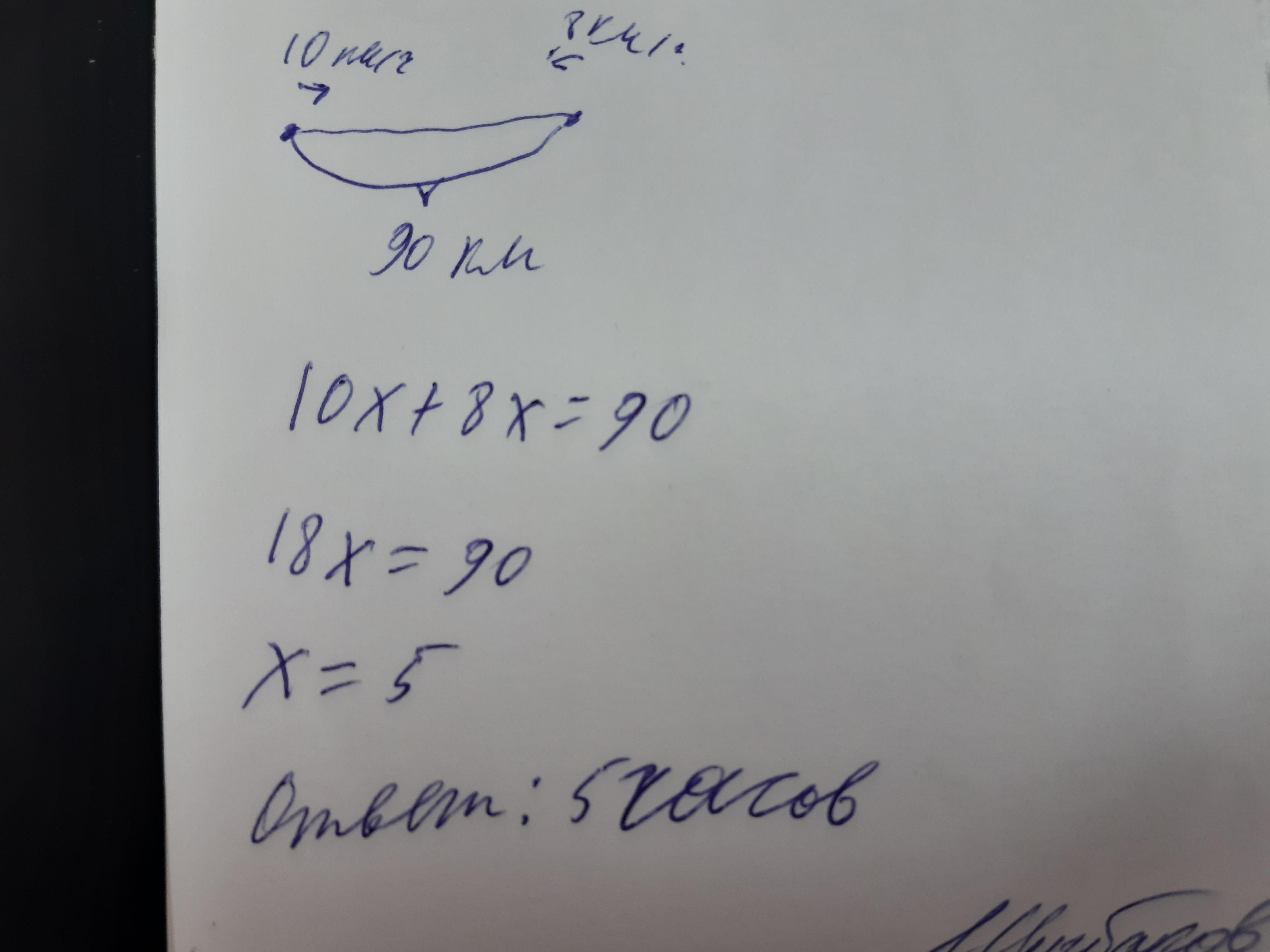 две лодки,растояние между которыми 90км/час начали движение на встречу друг другу .Скорость первого 10км/часа второго 8км/час.сколько часов понадобится лодкам,чтобы встретиться?