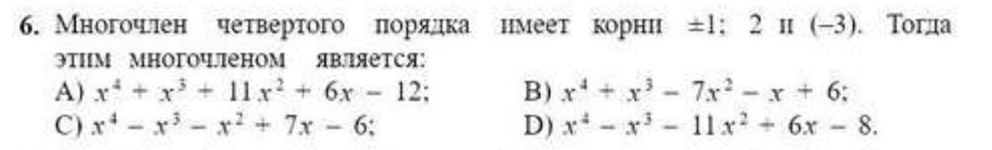 СРОЧНО! 40 БАЛЛОВ! многочлен четвертого порядка имеет корни +-1; 2 и (-3) тогда этим многочленом является:
