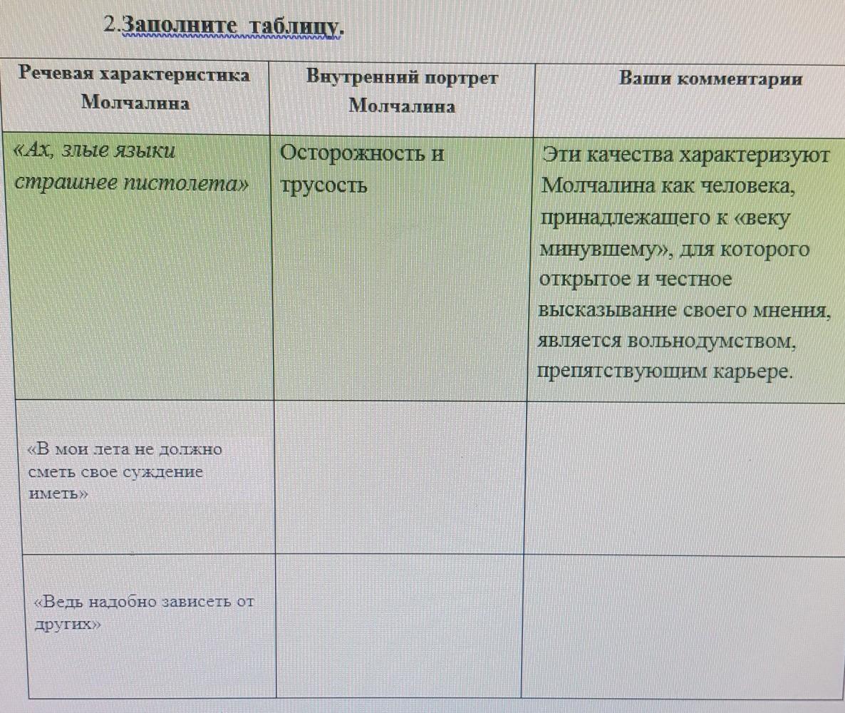 Молчалин старается не высказывать своего мнения и никого не критикует. По словам Софьи, Молчалин никого не критикует, "и вкривь и вкось не рубит", в отличие от Чацкого.