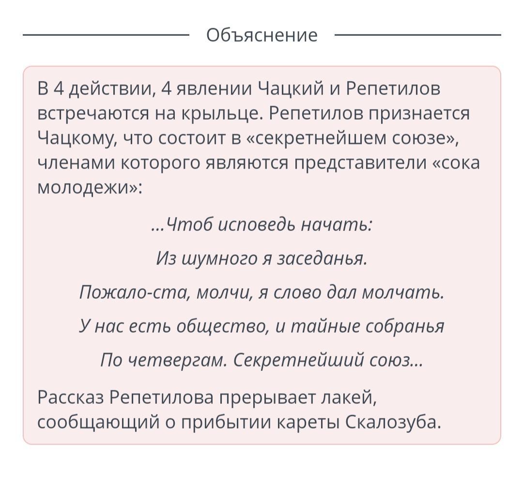 4. Репетилов рассказывает Чацкому о «секретнейшем союзе».