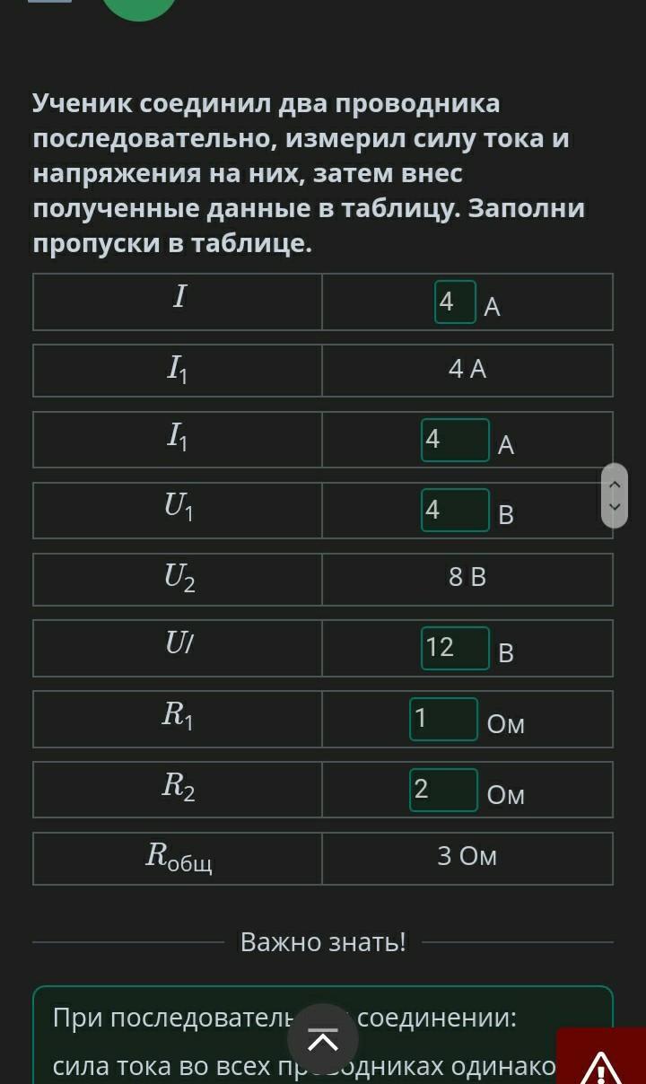 ученик соединил два проводника последовательно,измерил силу тока и напряжения на них,затем внёс полученные данные в таблицу.Заполни пропуски в таблице