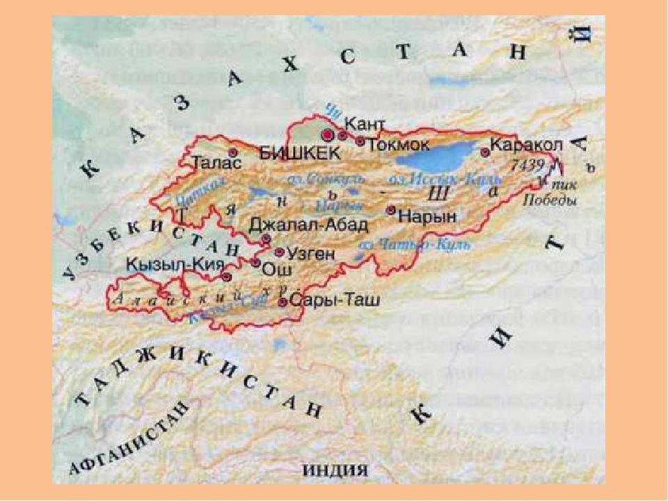 Кыргызстан расположен на материке Евразия, в части света Азия, в Средней Азии.Страна расположена севернее экватора, восточнее от 0 меридиана, севернее Северного тропика, южнее Северного полярного круга.Граничит с такими государствами как Казахстан, Китай, Таджикистан, Узбекистан.Страна не имеет выхода в Мировой океан.