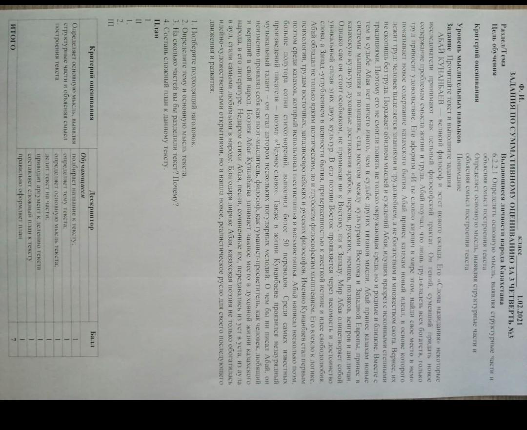 2)Тема текста, Абай Кунанбаев дал казахам много различных идей и умений. мысль текста, Автор хочет сказать что Абай Кунанбаев много чем помог разным народам