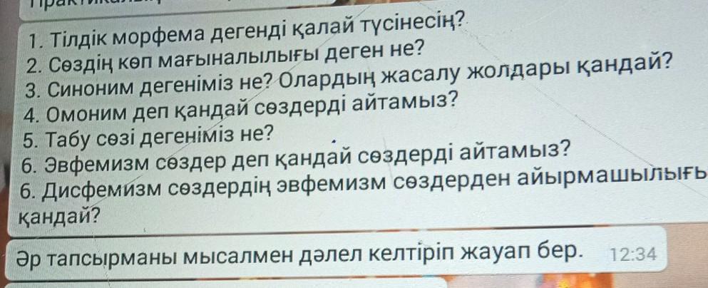 1.морфема тілдің негізгі морфологиялық бірлігі және ең кіші мағыналық, құрылымдық элементі. Басты сипаты екіжақтылығында: мазмұн өресі және жеткізу өресінен тұрады. Және оның осы екі өресі арасындағы қатынас біржақты емес: мысалы, бір жеткізу өресіне бірнеше мазмұн өресі сәйкес келуі мүмкін. Керісінше, бір мазмұн өресіне бірнеше жеткізу өресі сәйкес келуі мүмкін. Мысалы:бас,тіл,жол,кел,жүр морфемаларын алсақ,олардың әрқайсысы әрі түбір морфема,әрі жеке сөз бола алады